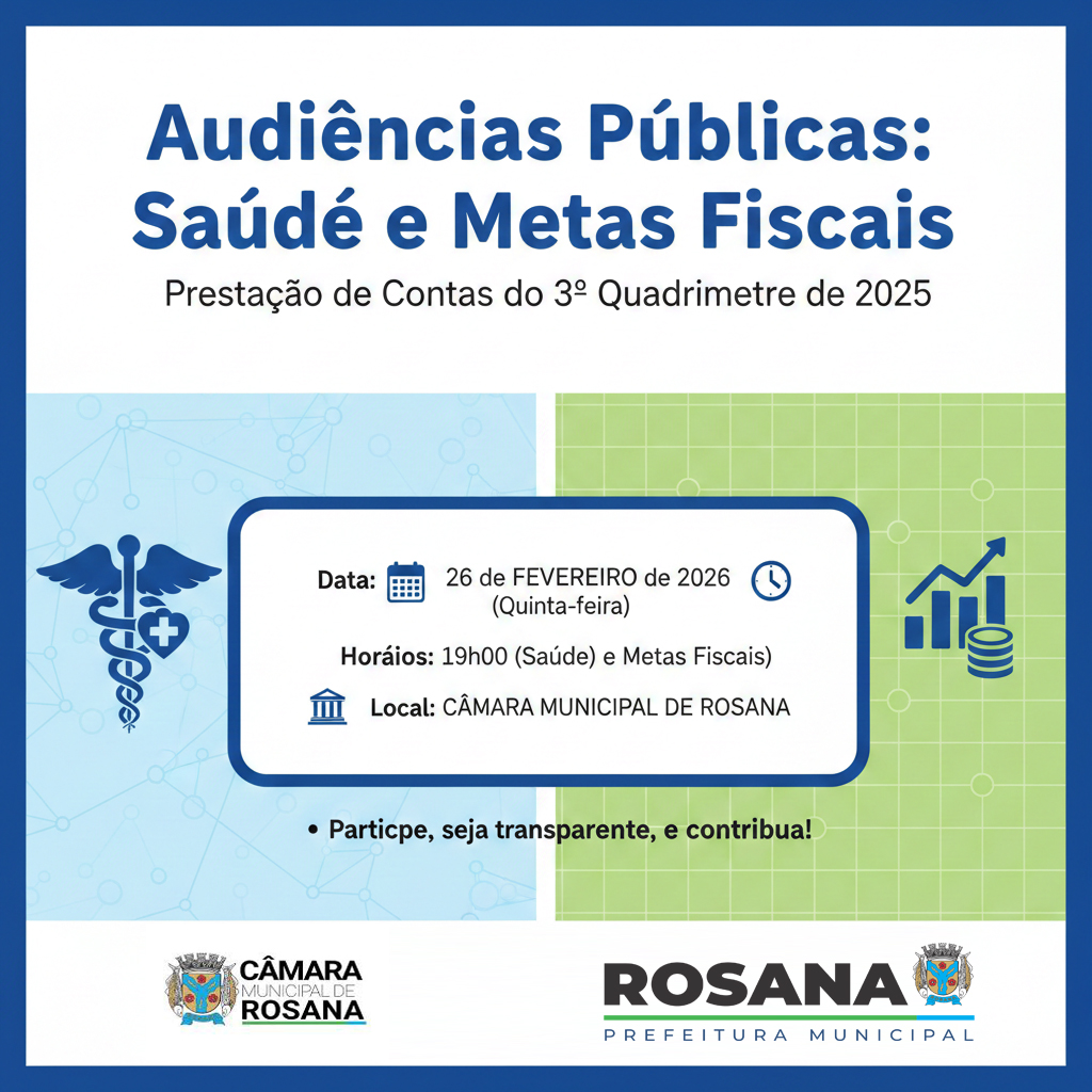 A Prefeitura Municipal de Rosana informa que serão realizadas Audiências Públicas no dia 26 de fevereiro de 2026, na Câmara Municipal, abertas à participação da população.
