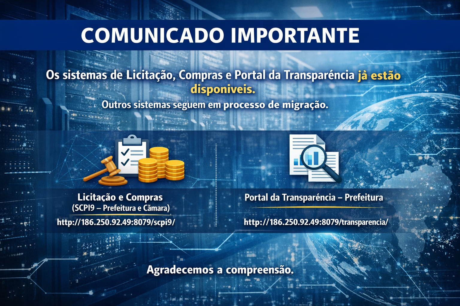 Em virtude da migração para o Data Center da Fiorilli, informamos que os sistemas de Licitação, Compras e Portal da Transparência encontram-se disponíveis.