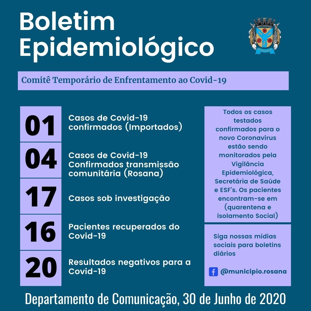 - 04 (quatro) casos confirmados em transmissão comunitária, sendo 01 (um) morador de Rosana e 03 (três) moradores do Distrito de Primavera que já estão cumprindo a quarentena em isolamento domiciliar.