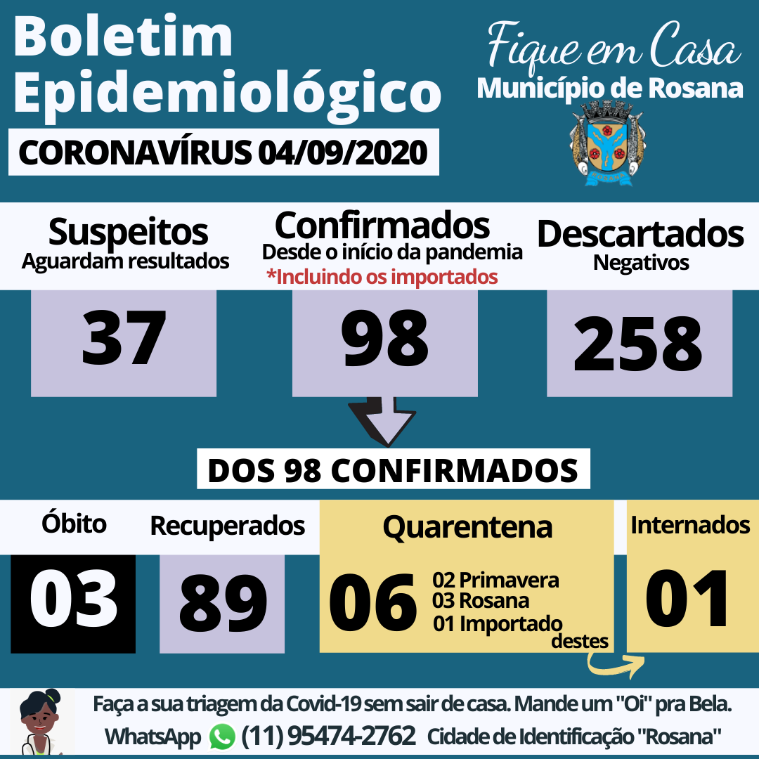 - 06 (seis) casos da Covid-19 em quarentena, sendo: (5 por transmissão comunitária, destes, 02 pacientes do Distrito de Primavera e 03 pacientes de Rosana) + 01 (um) caso importados, cumprindo os protocolos de isolamento domiciliar;