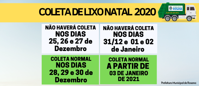 A Prefeitura Municipal de Rosana comunica que, em função das festividades de fim de ano, os serviços de coleta de lixo não serão realizados no município nos dias 25, 26 e 27 de dezembro e nos dias 31 de dezembro, 01 e 02 de janeiro de 2021. Nos dias 28, 29 e 30 de dezembro e após o dia 03 de janeiro, o serviço ocorrerá normalmente.