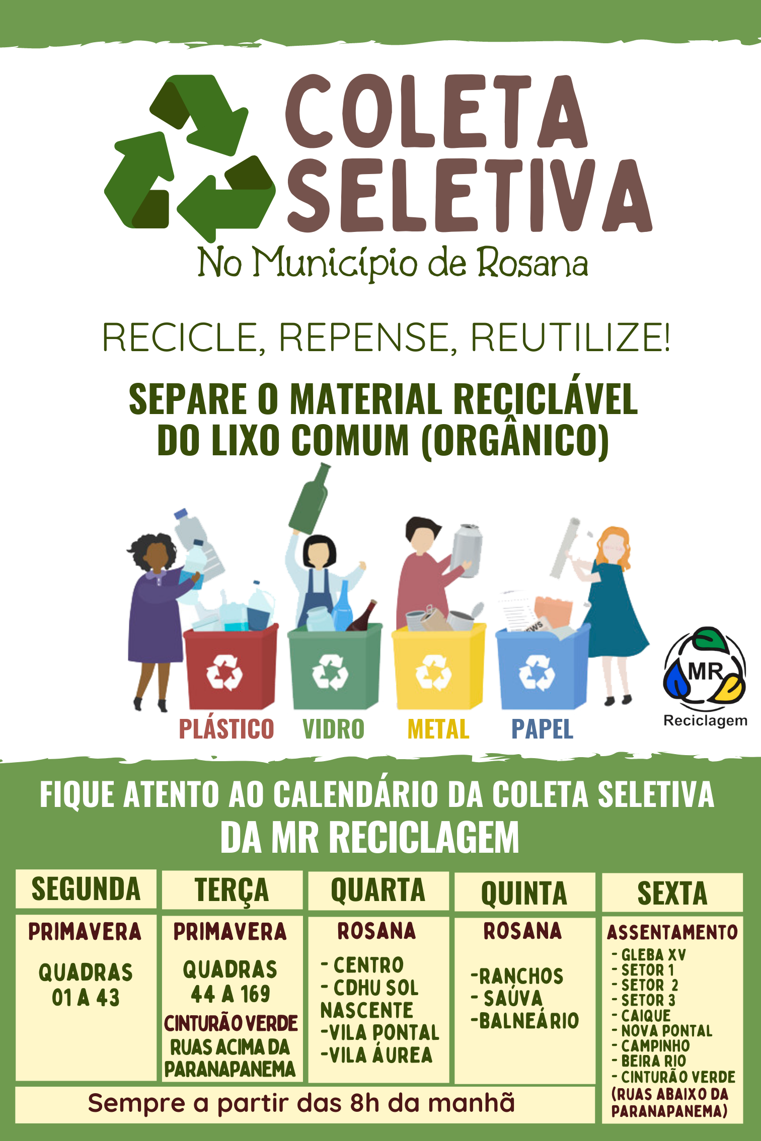 Uma parceria público-privada por meio de Chamamento Público entre a Prefeitura Municipal de Rosana e a Empresa MR Reciclagem, vêm promovendo a Coleta Seletiva de materiais recicláveis em todo o município.