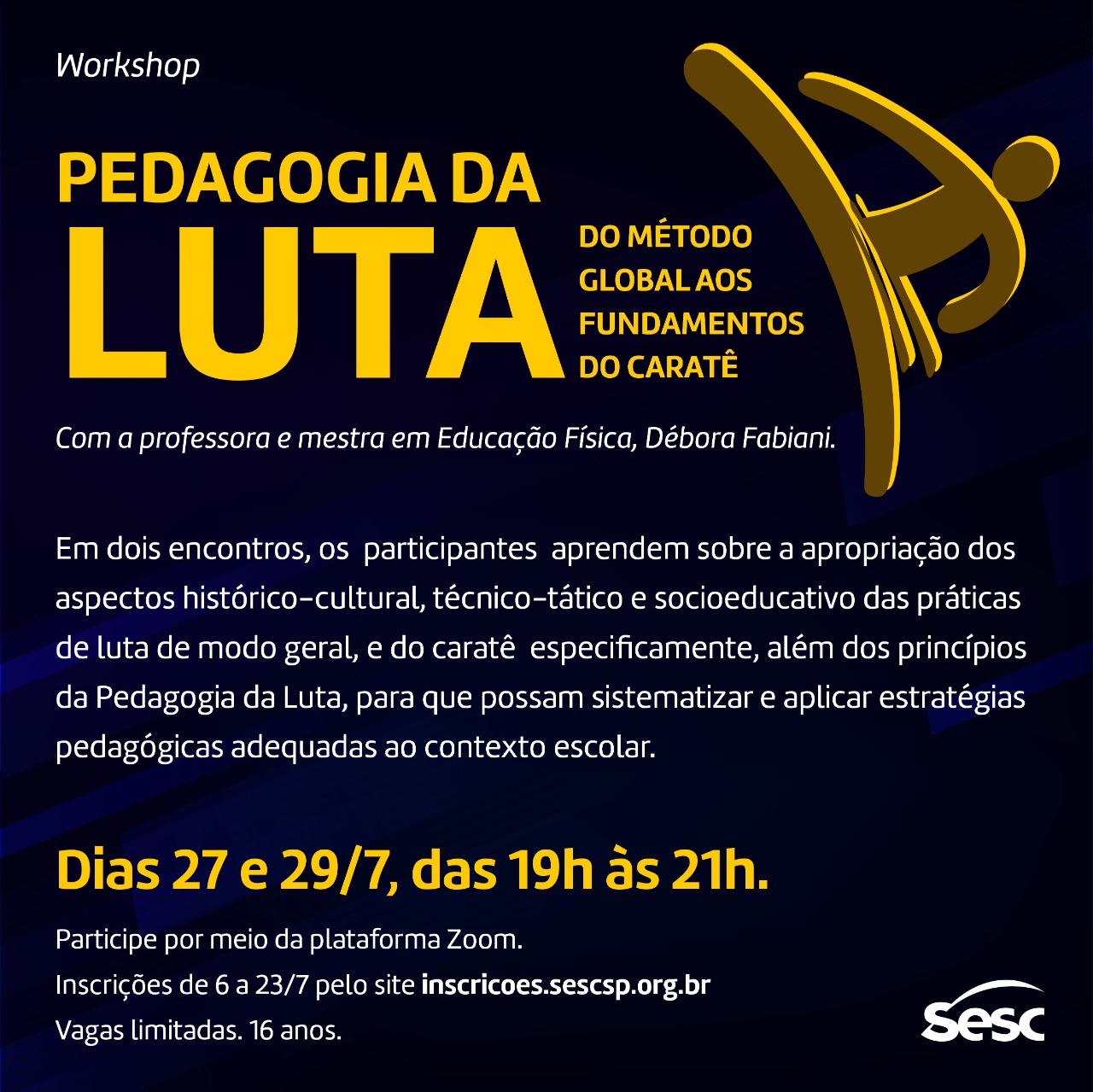 O Sesc Thermas de Presidente Prudente informa que seguem até sexta-feira, 23/07, as inscrições gratuitas para o workshop Pedagogia da Luta: Do Método Global aos Fundamentos do Karate, com participação pela plataforma Zoom. Acesse agora o link e faça a sua inscrição: inscricoes.sescsp.org.br/online/#/inscricao.