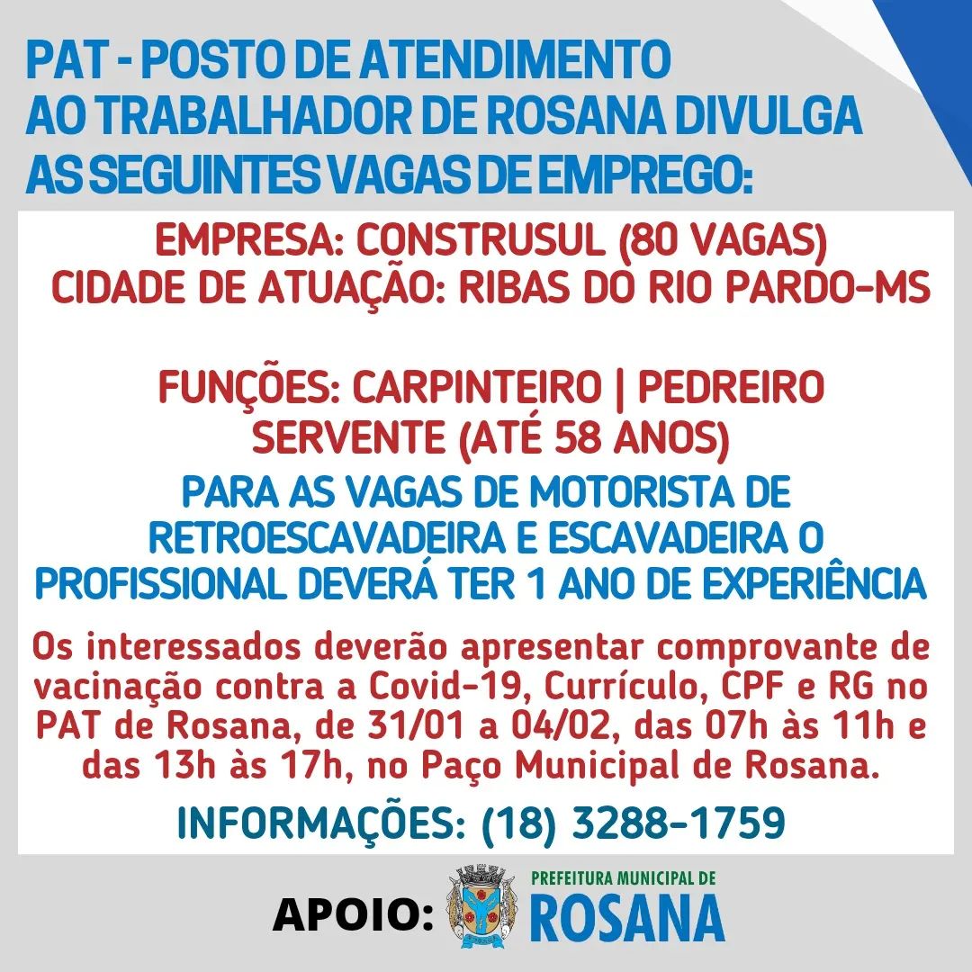 O PAT - Posto de Atendimento ao Trabalhador de Rosana, divulga vagas de emprego para empresa privada.