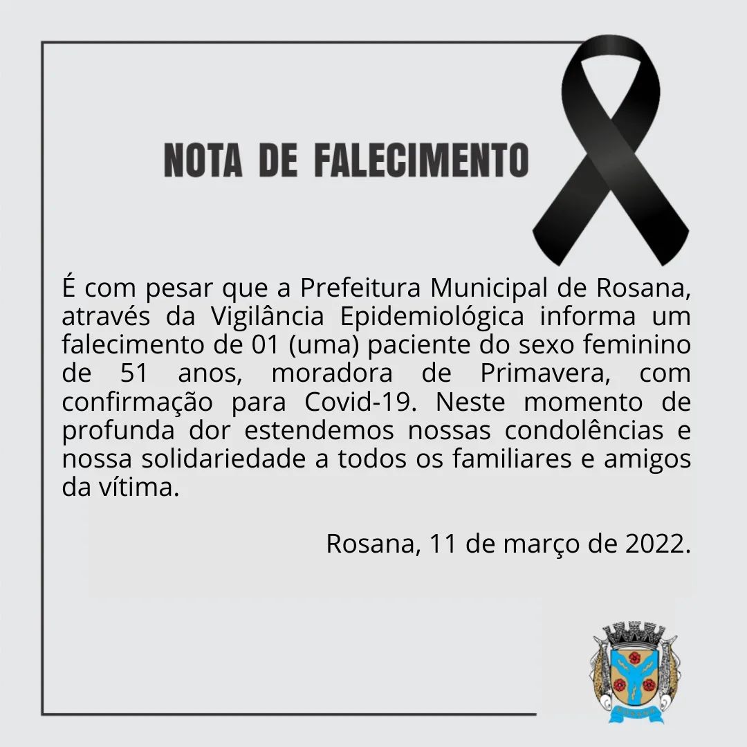 A Secretaria Municipal de Saúde de Rosana por meio do Comitê de Enfrentamento à Covid-19, informa à população que no Município de Rosana nesta sexta-feira, 11/03, 15 resultados (entre testes rápidos e PCRs) confirmaram positivo para Covid-19 (06 de Primavera, 07 de Rosana, 01 do Bairro Campinho, 01 da Gleba XV de Novembro), 23 resultados de PCR foram negativos, 24 coletas de PCR foram enviadas para análise e 01 óbito de uma paciente de 51 anos, do sexo feminino, moradora de Primavera foi registrado com confirmação para Covid-19, desta forma temos:
