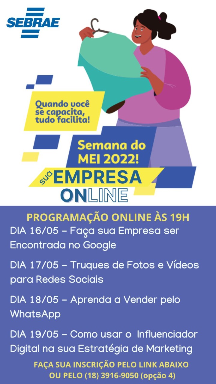 A Semana do MEI promovida pelo Sebrae-SP em Presidente Prudente terá uma programação voltada para ajudar os Microempreendedores Individuais a se destacarem digitalmente. Entre 16 e 19 de maio, às 19h, estão programadas palestras online com orientações práticas. As inscrições são gratuitas e podem ser feitas no telefone (18) 3916-9050 (opção 4) ou diretamente através do link: .