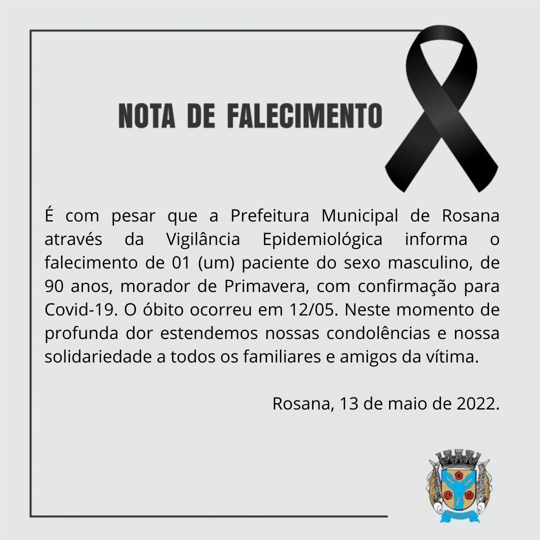 A Secretaria Municipal de Saúde de Rosana por meio do Comitê de Enfrentamento à Covid-19, informa à população que nesta sexta-feira, 13/05, 33 exames (de testes rápidos e PCR) confirmaram positivo para Covid-19 (26 de Primavera, 04 de Rosana, 03 da Gleba XV de Novembro), 21 exames de PCR testaram negativo, 48 pessoas estão recuperadas e 47 amostras de PCR foram enviadas para análise. É com pesar que a Vigilância Epidemiológica comunica 01 novo registro de óbito por Covid-19. O paciente era morador de Primavera, e tinha 90 anos. O óbito ocorreu em 12/05, desta forma temos: