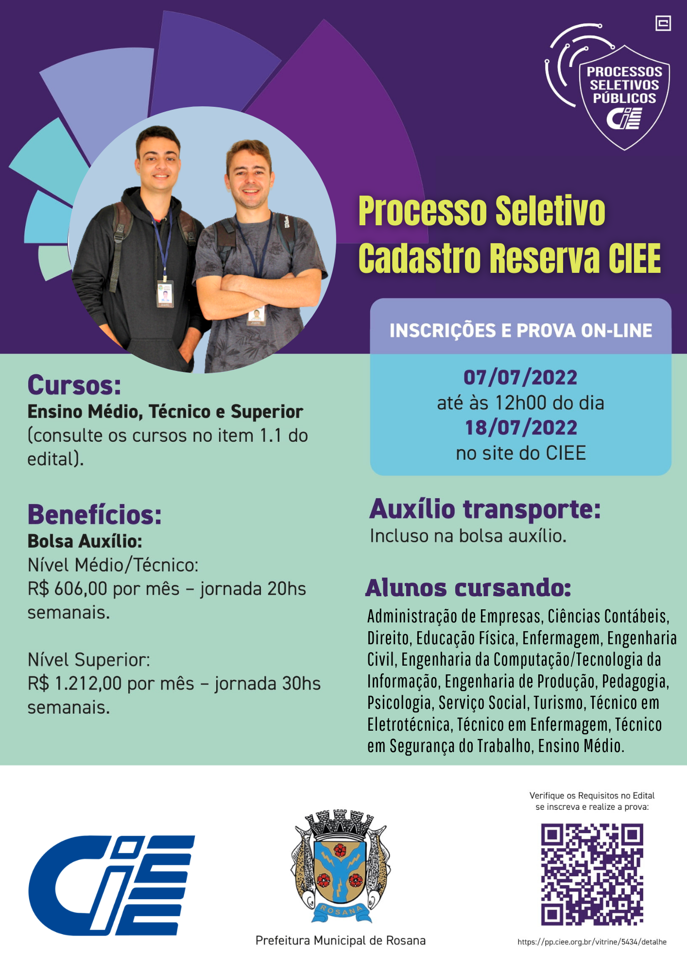 A Prefeitura Municipal de Rosana por meio da Diretoria de Recursos Humanos divulga a abertura de inscrições e prova on-line para o Processo Seletivo de Cadastro Reserva do CIEE 2022.