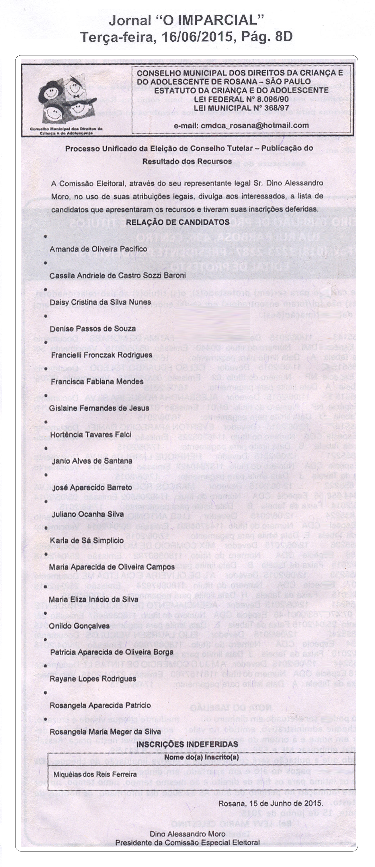 Atenção para a relação dos candidatos com inscrições deferidas para eleição do Conselho Tutelar Gestão 2016/2019.