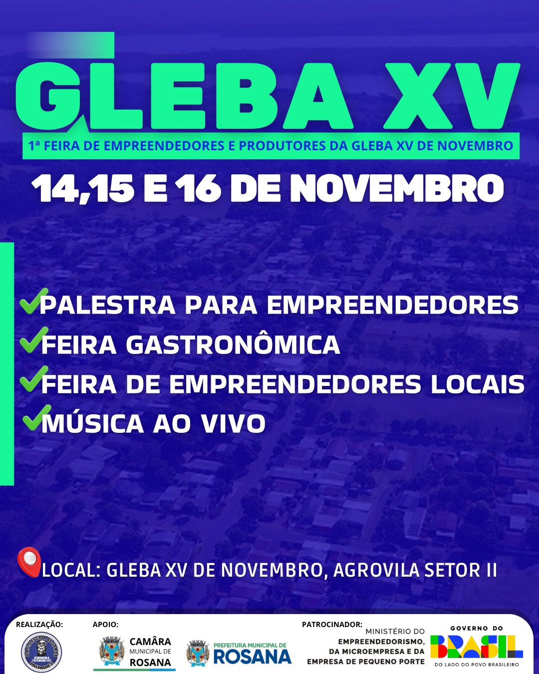 A Feira da Gleba XV do Empreendedor será um espaço de negócios, aprendizado e valorização da agricultura familiar, com exposição de produtos locais, palestras, oficinas, gastronomia e atrações culturais para toda a comunidade. 🎶🍲📚